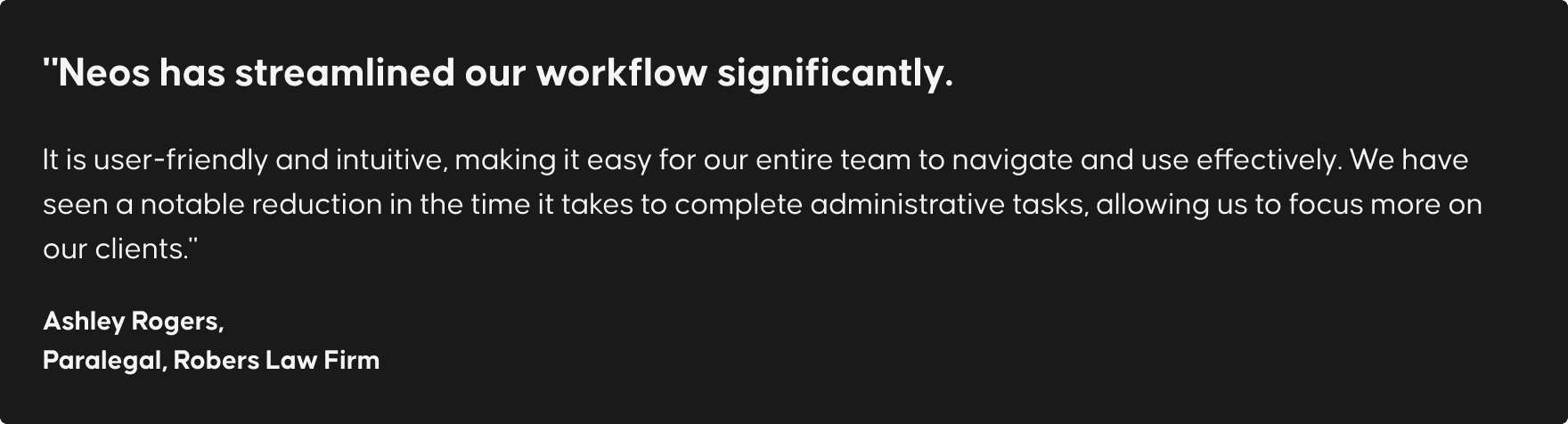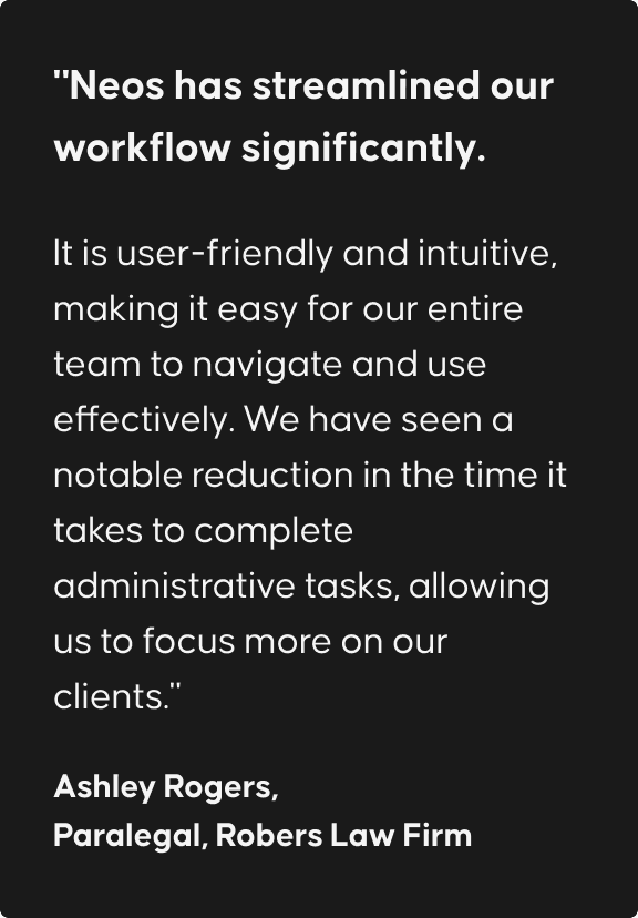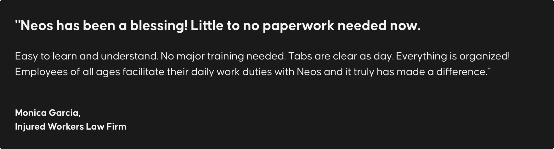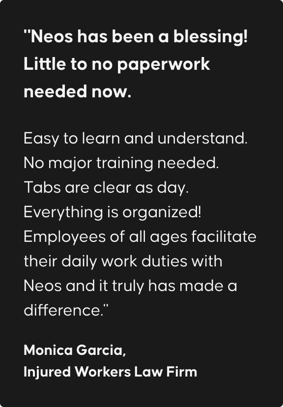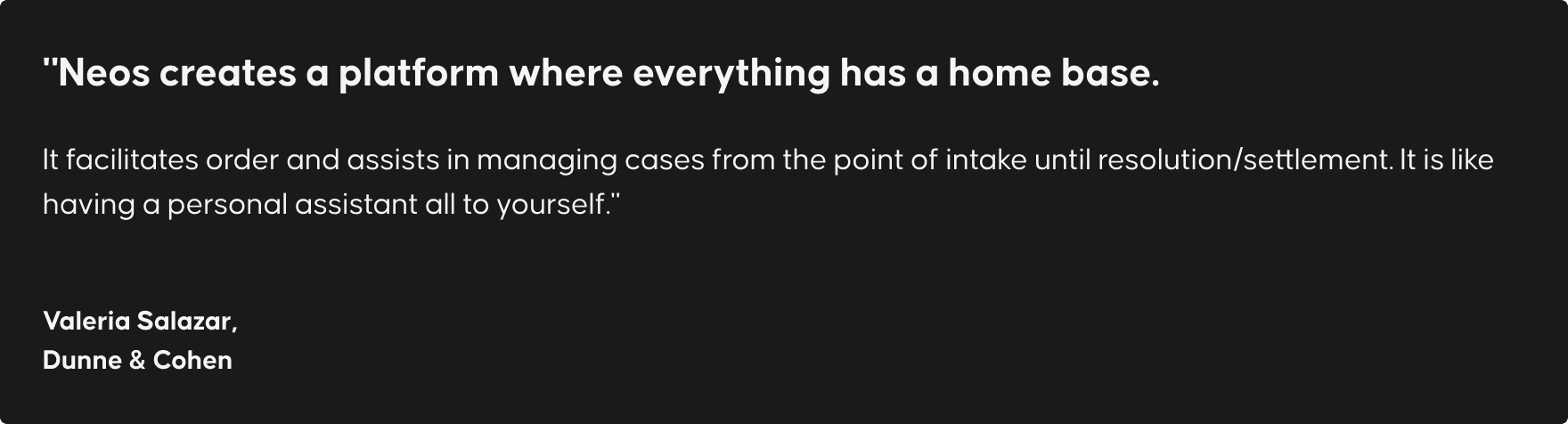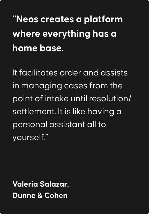 See how Neos helps personal injury firms streamline every case detail — from client intake to settlement.